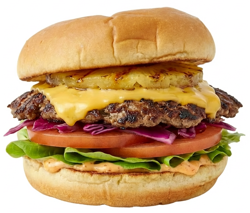 Juicy Wagyu beef stacked with fresh lettuce, tomato, red cabbage, sweet grilled pineapple, melty cheese, smoky BBQ sauce, and a kick of spicy chipotle mayo. Sweet, smoky, and just the right amount of heat — a tropical twist on a classic!