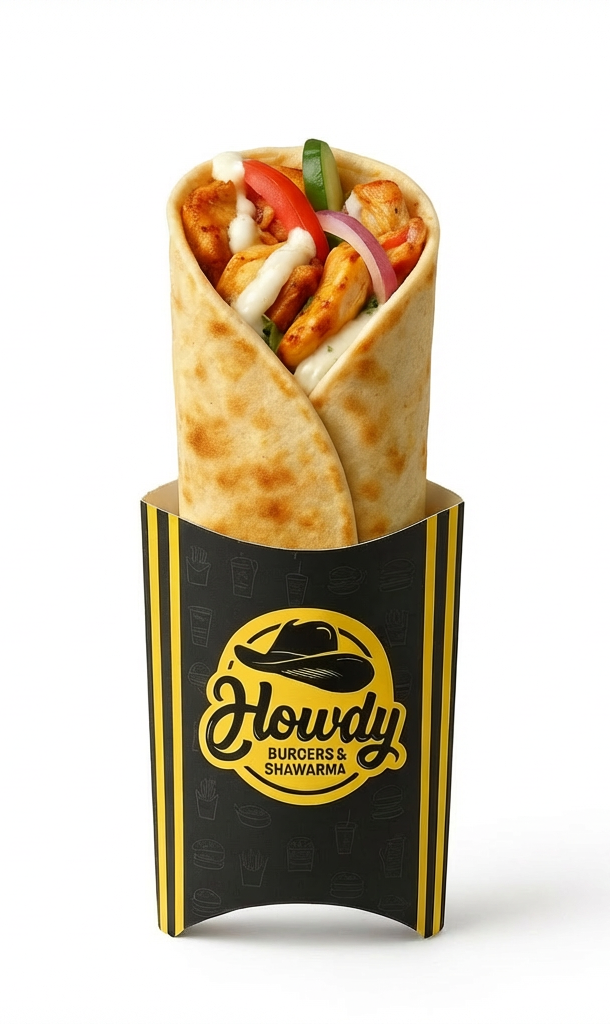 Tender, marinated chicken wrapped in warm pita bread, loaded with fresh salad mix ย (onions, tomatoes , cucumbers ), and topped with creamy garlic sauce plus our signature Howdy White & Red Sauces. A bold, juicy flavour bomb in every bite!