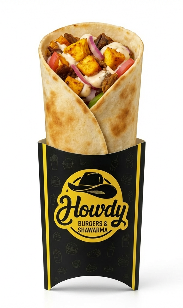 Deliciously marinated paneer pieces wrapped in soft pita bread, stuffed with fresh mixed salad ย (sumac onions, tomatoes, cucumbers ), and finished with creamy garlic sauce plus our signature Howdy White & Red Sauces. A bold, satisfying veggie twist packed with flavour!